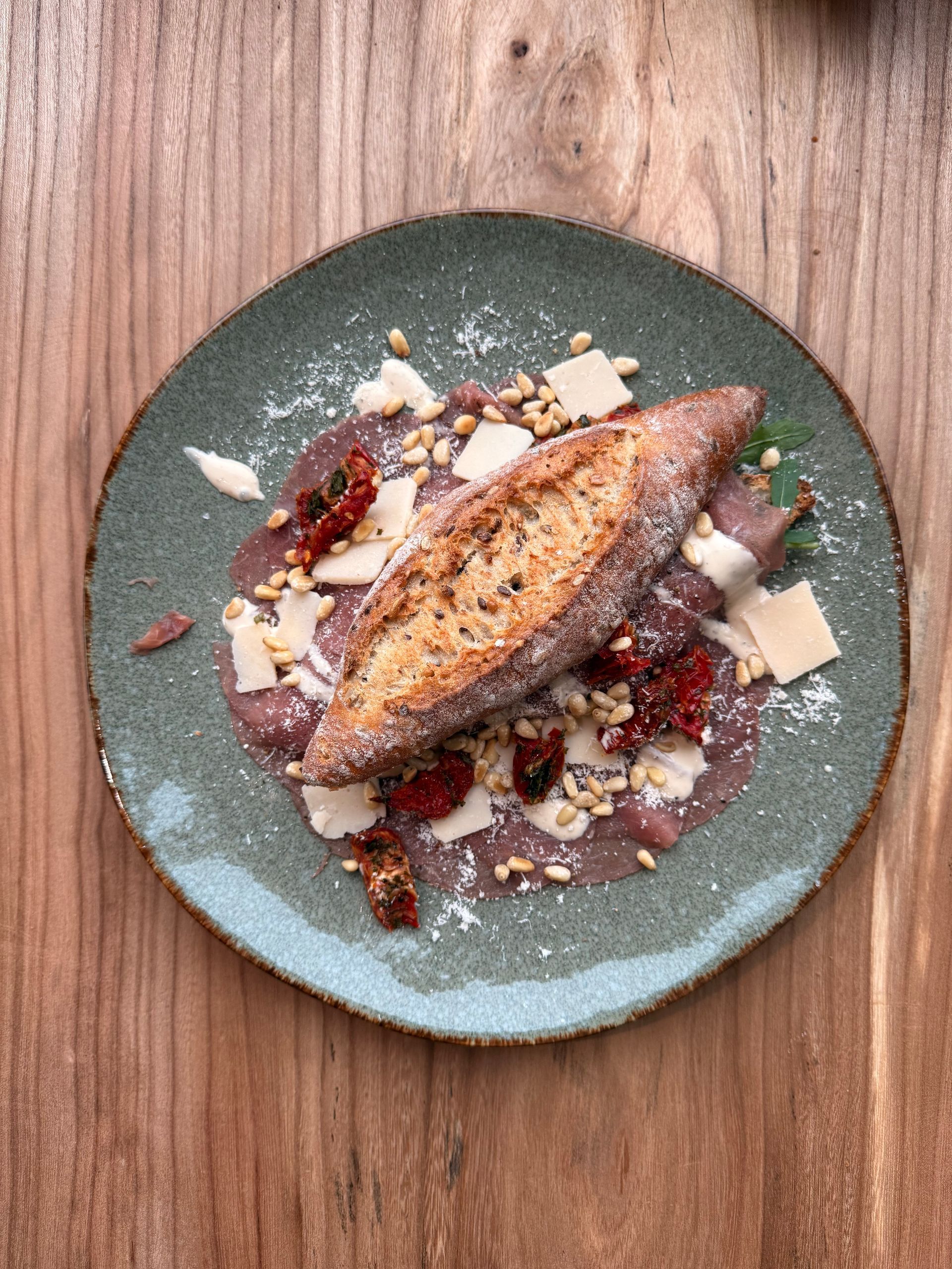 Met pesto, parmezaanse kaas, zongedroogde tomaten, pijnboompitten en rucola